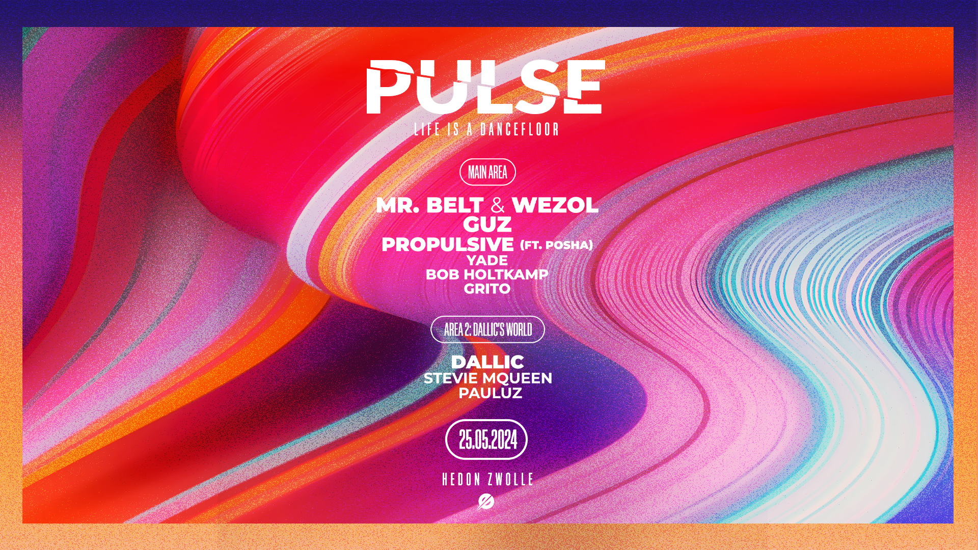 De eerste editie van PULSE wordt nu al onvergetelijk met de te gekke headliners: Mr. Belt & Wezol en GUZ. Mr. Belt & Wezol is een duo wat retro en nieuwe stijl naadloos samen weet te trekken. Met performances op Ultra, Tomorrowland en Mysteryland kunnen we niet anders dan heel erg trots zijn dat het is gelukt ze naar Zwolle te halen. En alsof het nog niet genoeg is kunnen we GUZ aankondigen als tweede headliner! Met keiharde bangers als Dancin Kinda Close en U Got My Love kreeg hij veel support door BBC Radio 1, stond hij op nummer 1 op Beatport en veel support door SLAM! Ook local heroes als Propulsive, Bob Holtkamp, Yade en Grito zijn van de partij, met een behoorlijke staat van dienst weten deze DJ’s als geen ander wat werkt achter de draaitafels. De 2nd area is het domein van DALLIC, wees welkom in zijn psychedelische wereld! Uiteraard is hij zelf van de partij, aangevuld met sets door, Pauluz en Stevie MQueen. Life is a dancefloor!