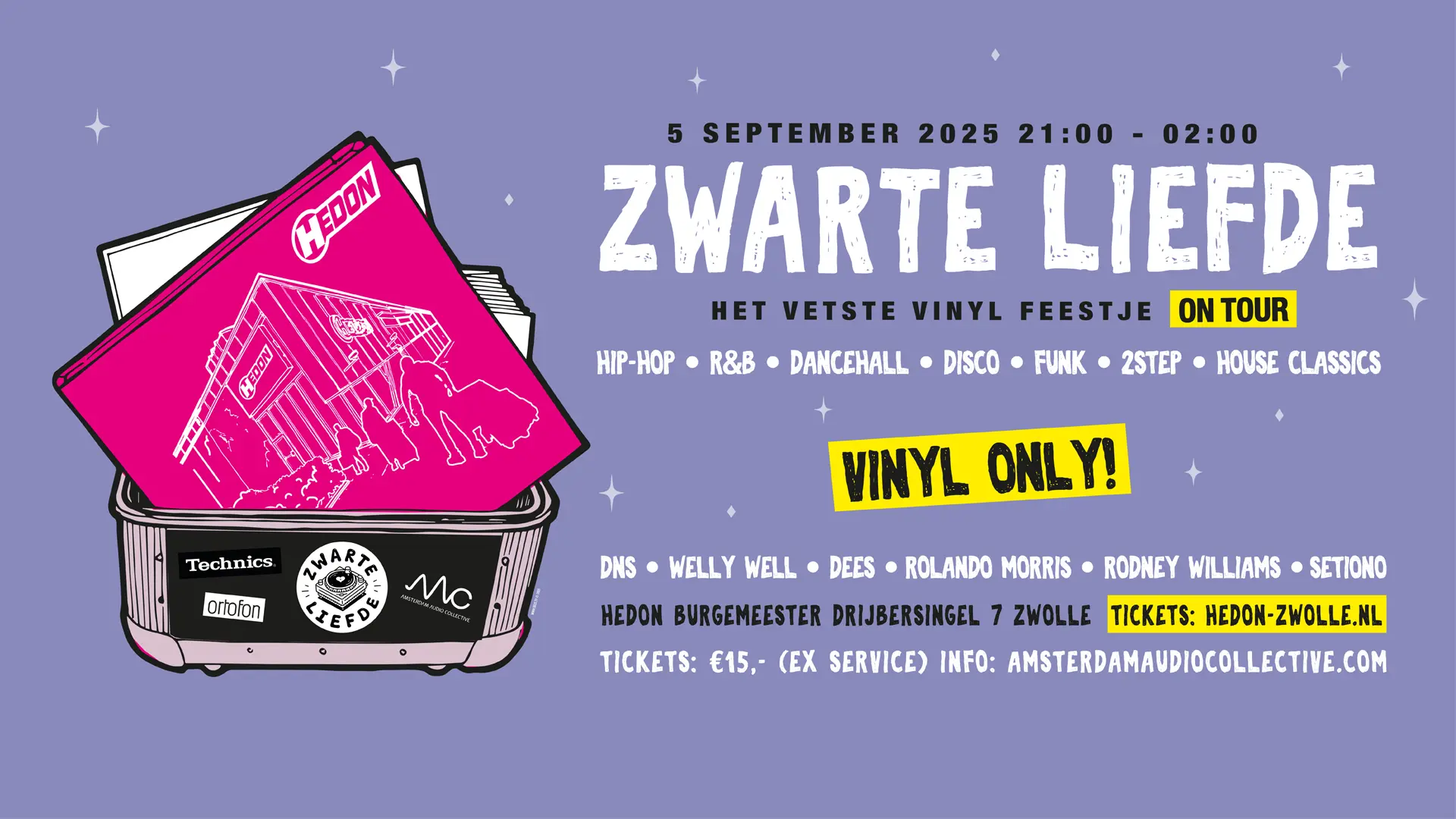 Vinyl is terug ... zoals het hoort! In een digitale wereld is het soms bijna nostalgisch om herinneringen op te halen aan de vroege analoge dagen. Bij Zwarte Liefde vieren we dan ook onze liefde voor vinyl en zwarte muziek. Alle DJ's zullen 100% vinyl draaien, dat betekent authenticiteit en dat kenmerkende warme geluid. We gaan van scratches naar smooth blends met een mix van hiphop, r&b, dancehall, soul, funk, disco en zelfs garage of house classics.