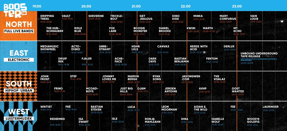 In de avond presenteren artiesten zich in vier festival area’s door middel van sessies, videoclips en livestreams. Iedere artiest die is geselecteerd voor het Booster Festival kan meedoen met een eigen video of livestream. Alles komt samen op diverse, door Booster georganiseerde, visuele radiostreams. Deze streams zijn te volgen via de website van het festival.