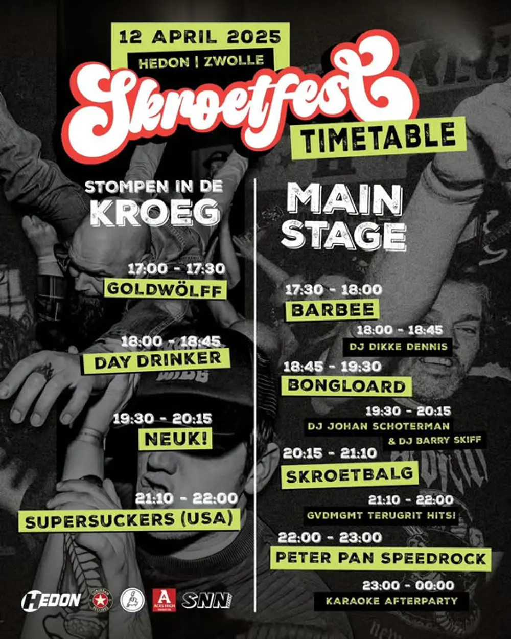 Skroetbalg, het Drentse punkrock commando, verhuist de derde editie van hun eigen Skroetfest van, naar eigen zeggen, 'het meest noordelijke puntje van Drenthe' (Groningen Stad) naar 'het meest zuidelijke puntje van Drenthe' (Zwolle). En wel hier in Hedon! Zaterdag 12 april 2025 kun je een lawaaiige melange van punkrock, rock 'n' roll, bier en moshpits verwachten, eigenlijk álles waar De Balgen zelf ook van houden! En wat een bands staan er op het programma!