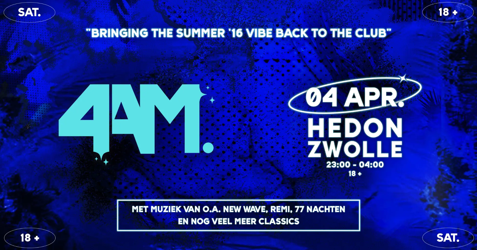 Een avond vol energie & nostalgie, waarbij elke track weer hit alsof je hem te lang niet hebt gehoord. Met hits van o.a. New Wave, 77 Nachten, HWPO en nog veel meer classics waar je niet stil bij kunt blijven staan. Op 4 april blaast 4AM.’s nostalgische soundtrack weer door de speakers van Hedon heen terwijl jij alles woord voor woord meezingt.